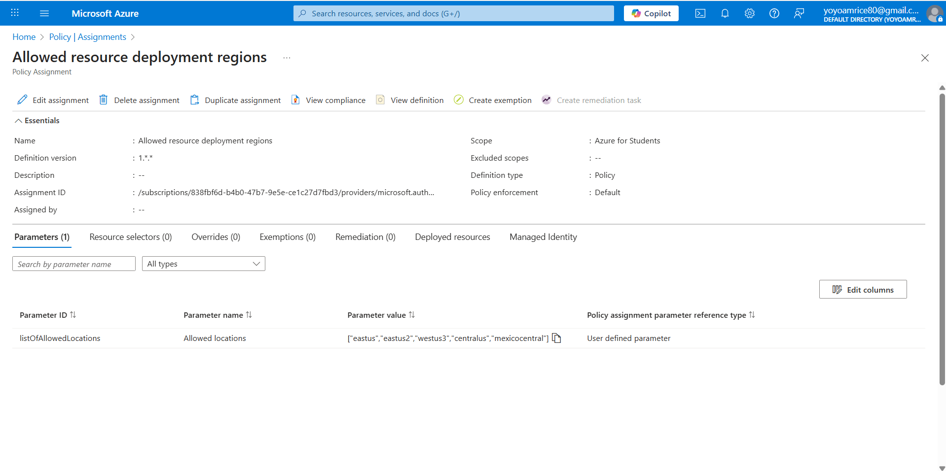 If available, click the Assignment named "Allowed resource deployment regions".
