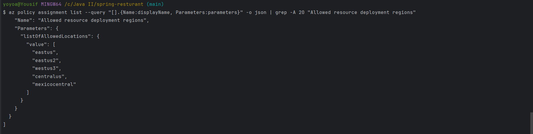 az policy assignment listaz policy assignment list --query "[].{Name:displayName, Parameters:parameters}" -o json | grep -A 20 "Allowed resource deployment regions"az login
