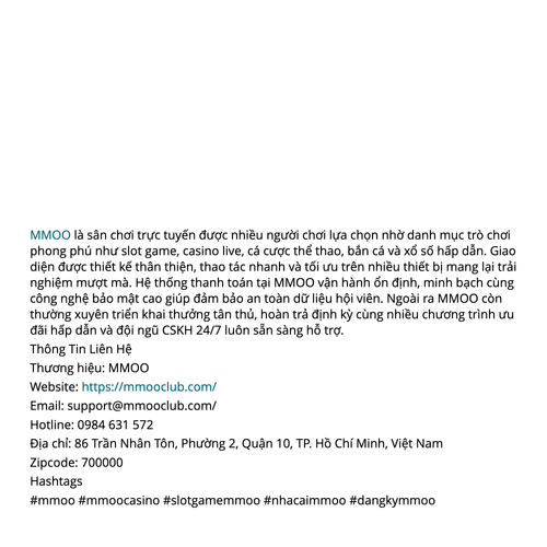 MMOO là sân chơi trực tuyến được nhiều người chơi lựa chọn nhờ danh mục trò chơi phong phú như slot game, casino live, cá cược thể thao, bắn cá và xổ số hấp dẫn. Website: https://mmooclub.com/