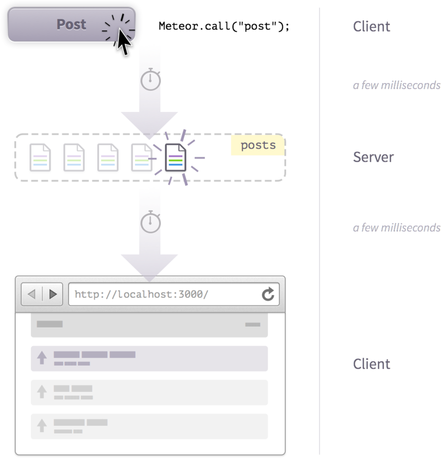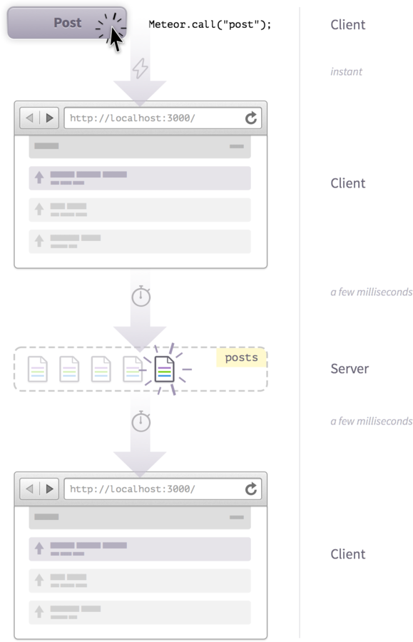 Pour éviter ce problème, Meteor introduit un concept appelé Compensation de latence. Quand nous avons définit notre Méthode POST, nous l'avons placée à l'intérieur d'un fichier dans le répertoire COLLECTIONS. Ceci signifie qu'elle est disponible pour le serveur et le client – et elle s'exécutera sur les deux en même temps !