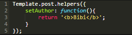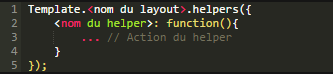 Leur utilisation à l'intérieur des templates ne change pas et ils peuvent être appelés dans tous les templates. En revanche leur déclaration est un peu différente. Leur emplacement dans l'application n'est pas importante pour Meteor, il est recommandé de les regrouper dans un seul fichier: par exemple /client/config/Helpers.js.