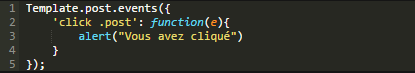 Dans le côté client de l'application, vous ne pouvez pas ajouter du JavaScript donc les événements ajoutés de manière classique ne fonctionneront pas. Mais pas de panique! Meteor vous offre une manière encore plus pratique pour les intégrer: