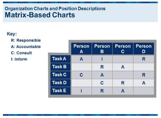 Matrix diagrams are used to illustrate the relationship among various factors. Matrix-based charts can be in the form of a responsibility assignment matrix (RAM) that documents the roles of the project team members. One such type of RAM is called a responsible, accountable, consult, and inform (RACI) chart that lists the work to be done on the left as activities. The resources assigned to work on these activities are listed across the top of the chart and can be shown as individuals or groups, depending on the level of detail that the chart shows.