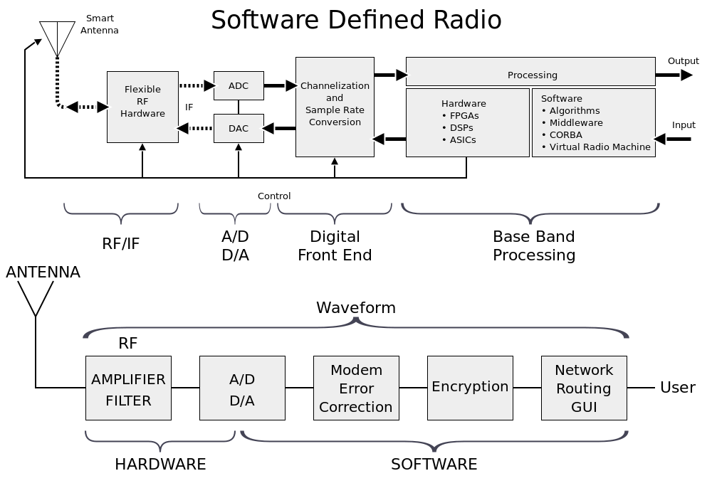 - Radio transceiver whose system components such a filters, mixers etc. have been implemented in software.