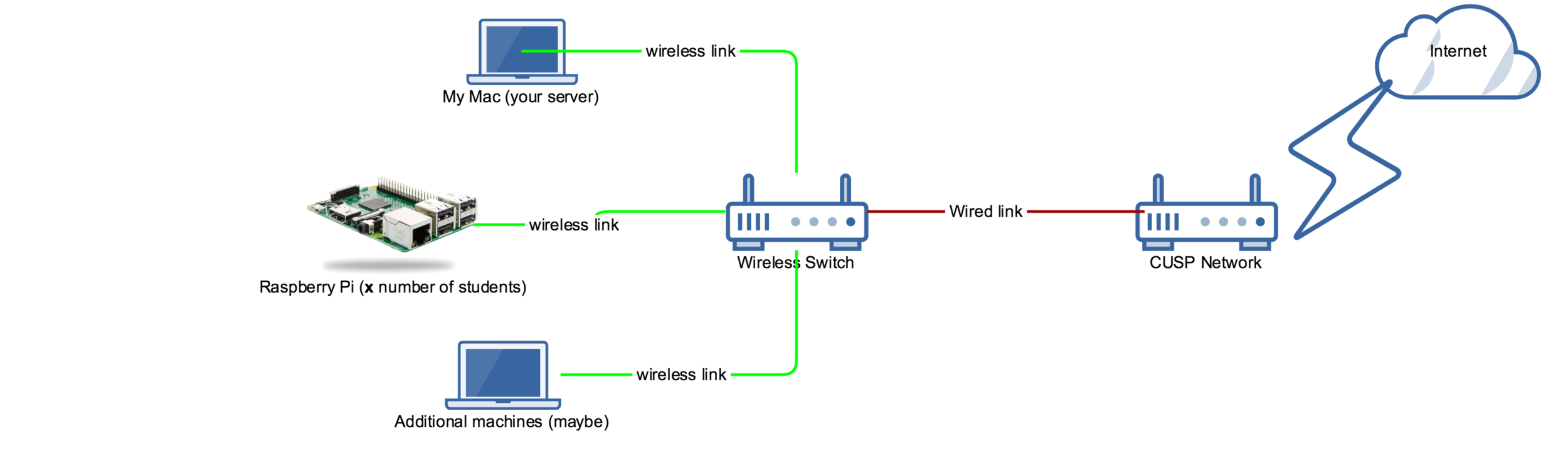 Connect to WiFi: iotclass-5, (authentication: iotclass5) Go to: http://192.168.1.99:8888 (note the port number) Login with your NYU net-id Download the ssh key (Make note of the IP address (this is where your Pi is waiting for you!!)