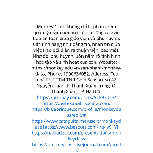 Website: https://monkey.edu.vn/san-pham/monkey-class. Monkey Class không chỉ là phần mềm quản lý mầm non mà còn là công cụ giao tiếp an toàn giữa giáo viên và phụ huynh. Các tính năng như bảng tin, nhắn tin giúp việc trao đổi diễn ra thuận tiện, bảo