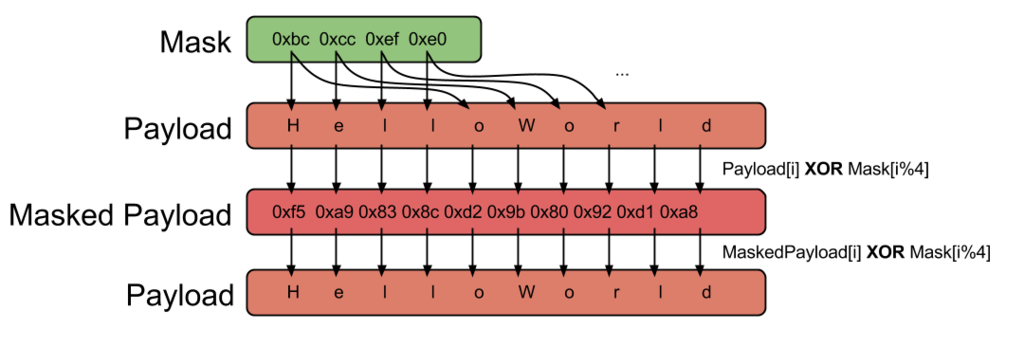 0 1 2 3 0 1 2 3 4 5 6 7 0 1 2 3 4 5 6 7 0 1 2 3 4 5 6 7 0 1 2 3 4 5 6 7 +-+-+-+-+-------+-+-------------+------------------------------+ |F|R|R|R| Opcode|M| Payload len | Extended payload length | |I|S|S|S| (4) |A| (7) | (16 or 64) | |N|V|V|V| |S| | (if payload len == 126/127) | | |1|2|3| |K| | | +-+-+-+-+-------+-+-------------+------------------------------+ | Extended payload length continued, if payload len == 127 | +-------------------------------+------------------------------+ | |Masking-key, if MASK set to 1 | +-------------------------------+------------------------------+ | Masking-key continued | Payload Data | +-------------------------------+------------------------------+ : Payload Data continued ... : +--------------------------------------------------------------+ | Payload Data continued ... | +--------------------------------------------------------------+