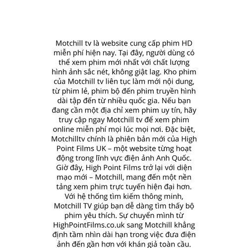 Website: https://www.highpointfilms.co.uk/. Motchill tv là nền tảng xem phim trực tuyến hàng đầu hiện nay. Tại đây, người dùng có thể xem phim mới nhất với chất lượng hình ảnh sắc nét, hỗ trợ nhiều thiết bị. Kho phim của Motchill luôn cập nhật nh