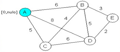 1. Se escoge el nodo inicio, en este caso el nodo A. Luego, se marca en el nodo la distancia desde el nodo anterior, pero como no lo hay, se deja nulo.