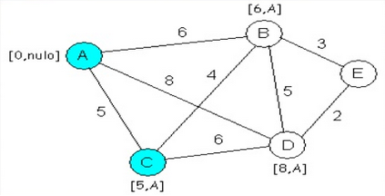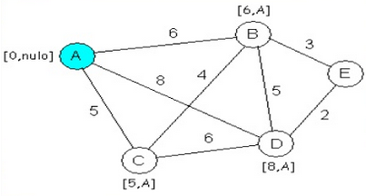 2. De los nodos adyacentes de A, se marca el peso acumulado junto con el nodo antecesor, es decir, A.