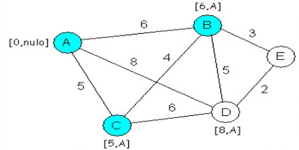 6. De los nodos ya visitados y no marcados de azul, se toma el de menor peso, en este caso el D.