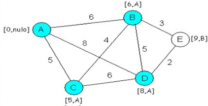 4. De los nodos adyacentes de B, se marca el peso acumulado junto al nodo antecesor (nodo B).