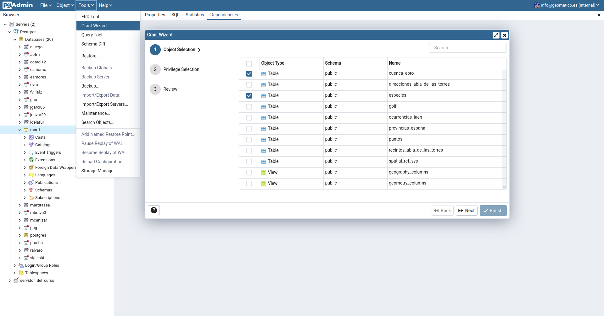 SELECT rolname FROM pg_roles;Grant Wizard (pgAdmin)