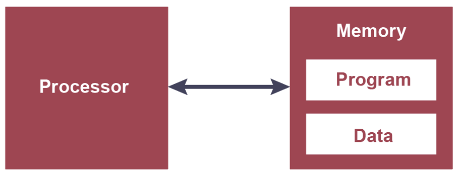 Instructions and data are stored in a common main memory and transferred using a single shared bus