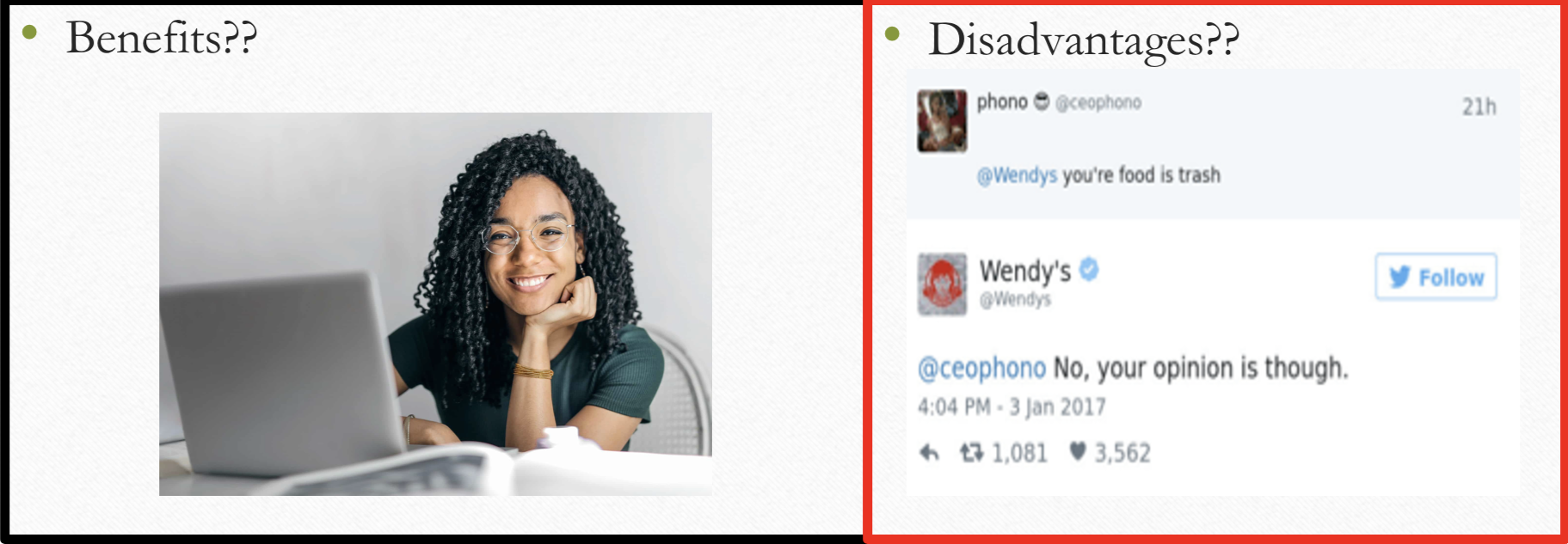 - Benefits and disadvantages of each social media platform.