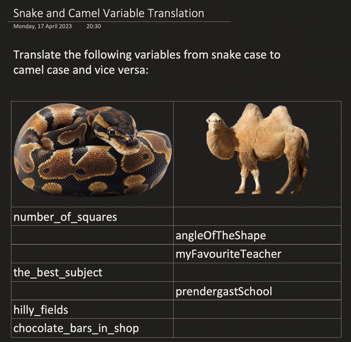 - Give examples of and translate between Snake Case and Camel Case variable names