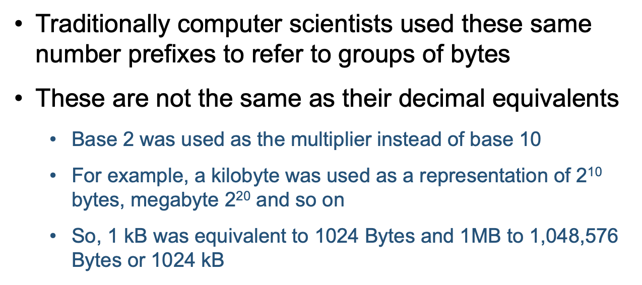 - The same number prefixes for decimal values can be used to summarise large quantities of bytes