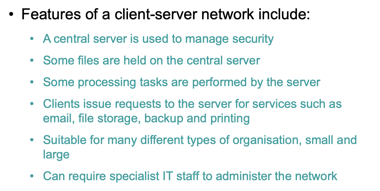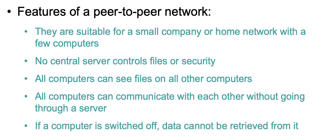 | Peer to Peer | Cheap to set up and maintain | Files and programs saved on individual Computers. Can be used for sharing of music and streaming of live events. |