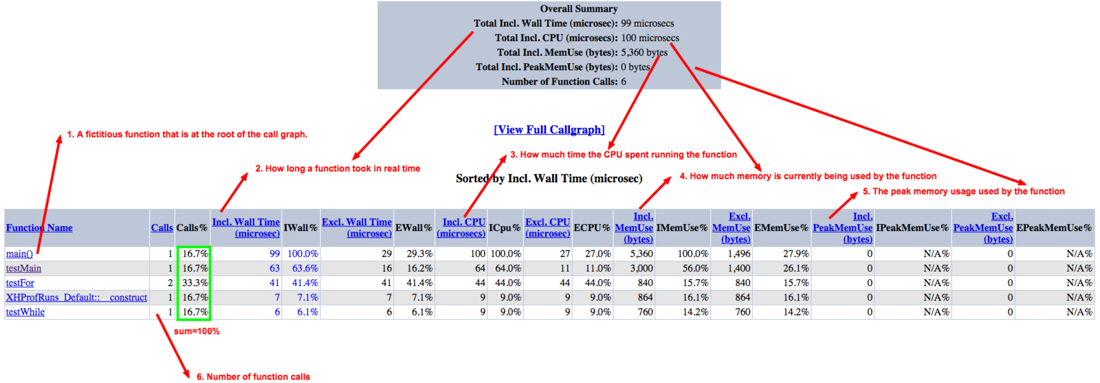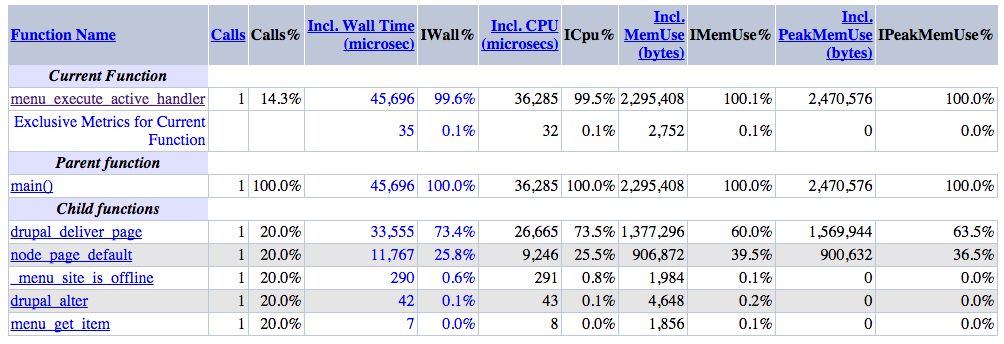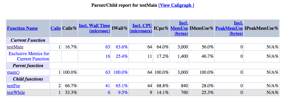 Function-level summary information such as number of calls, inclusive/exclusive wall time, memory usage, and CPU time.