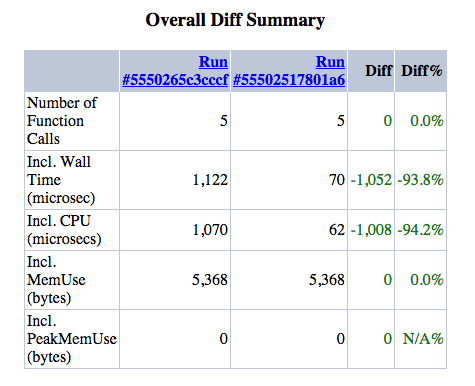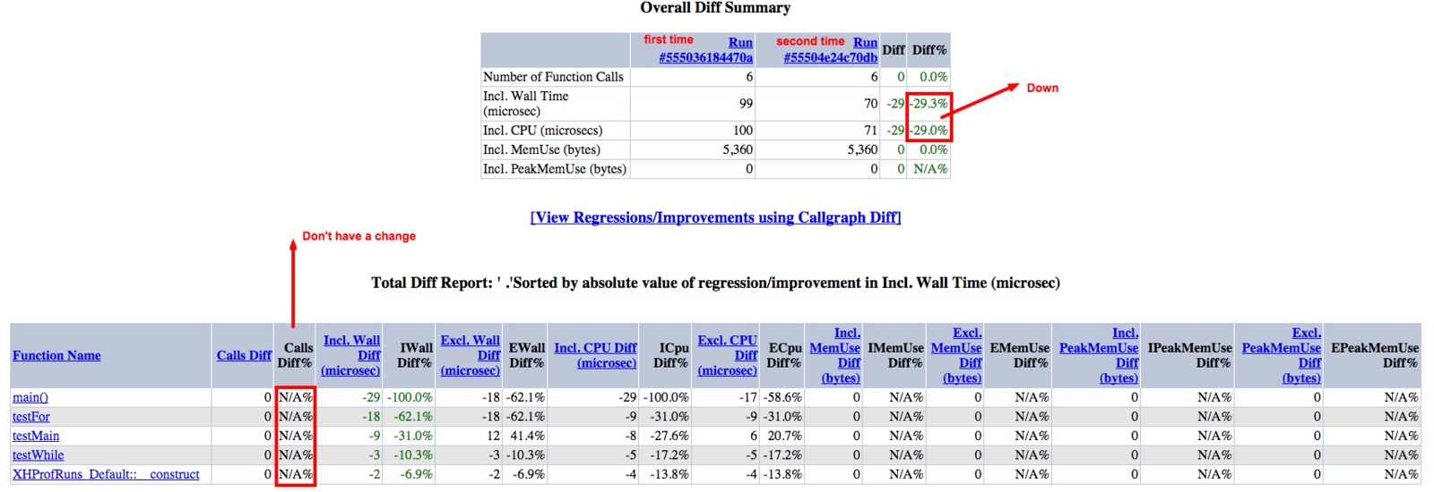 A diff report takes two runs as input and provides both flat function-level diff information, and hierarchical information (breakdown of the diff by parent/children functions) for each function.
