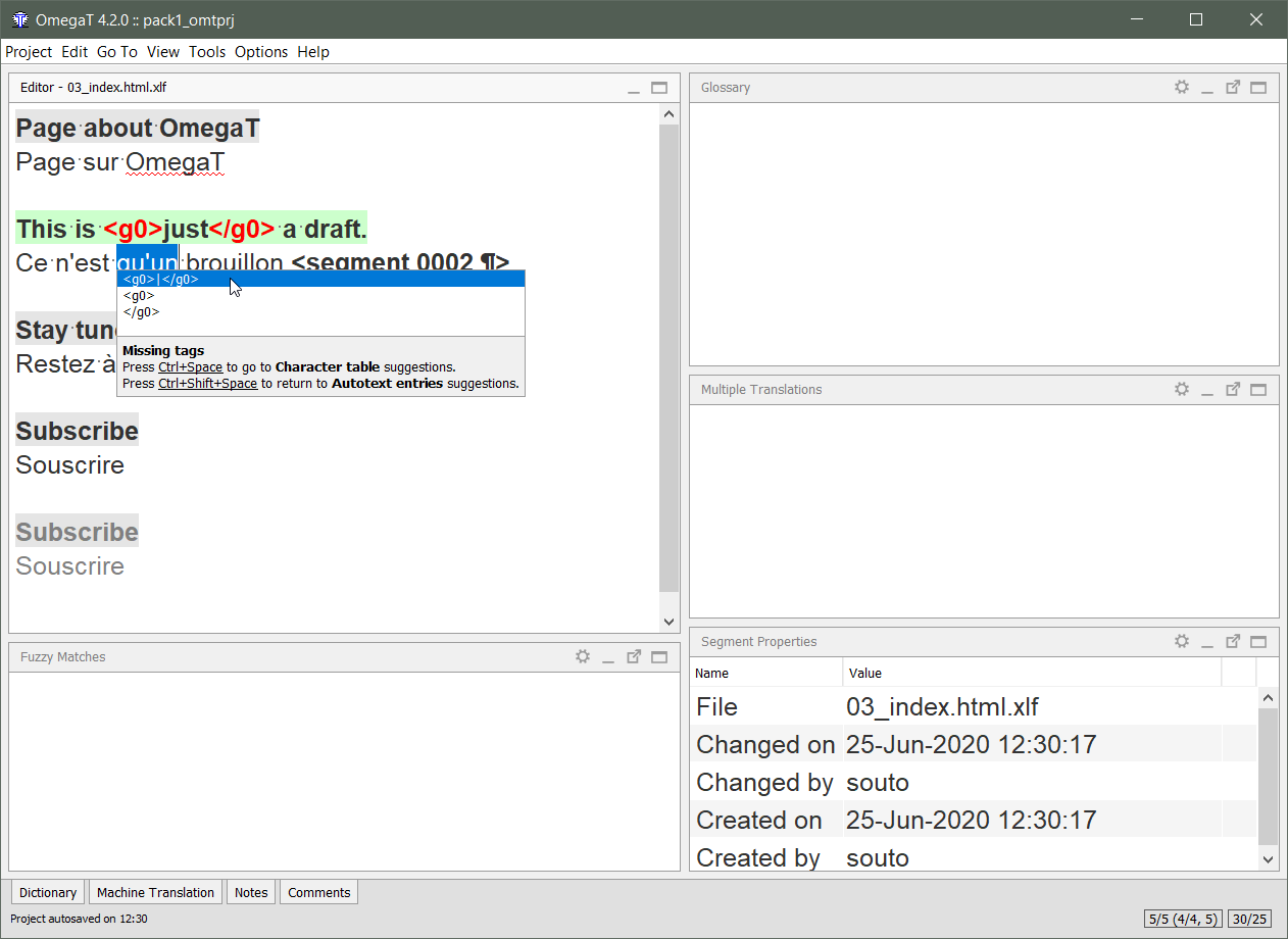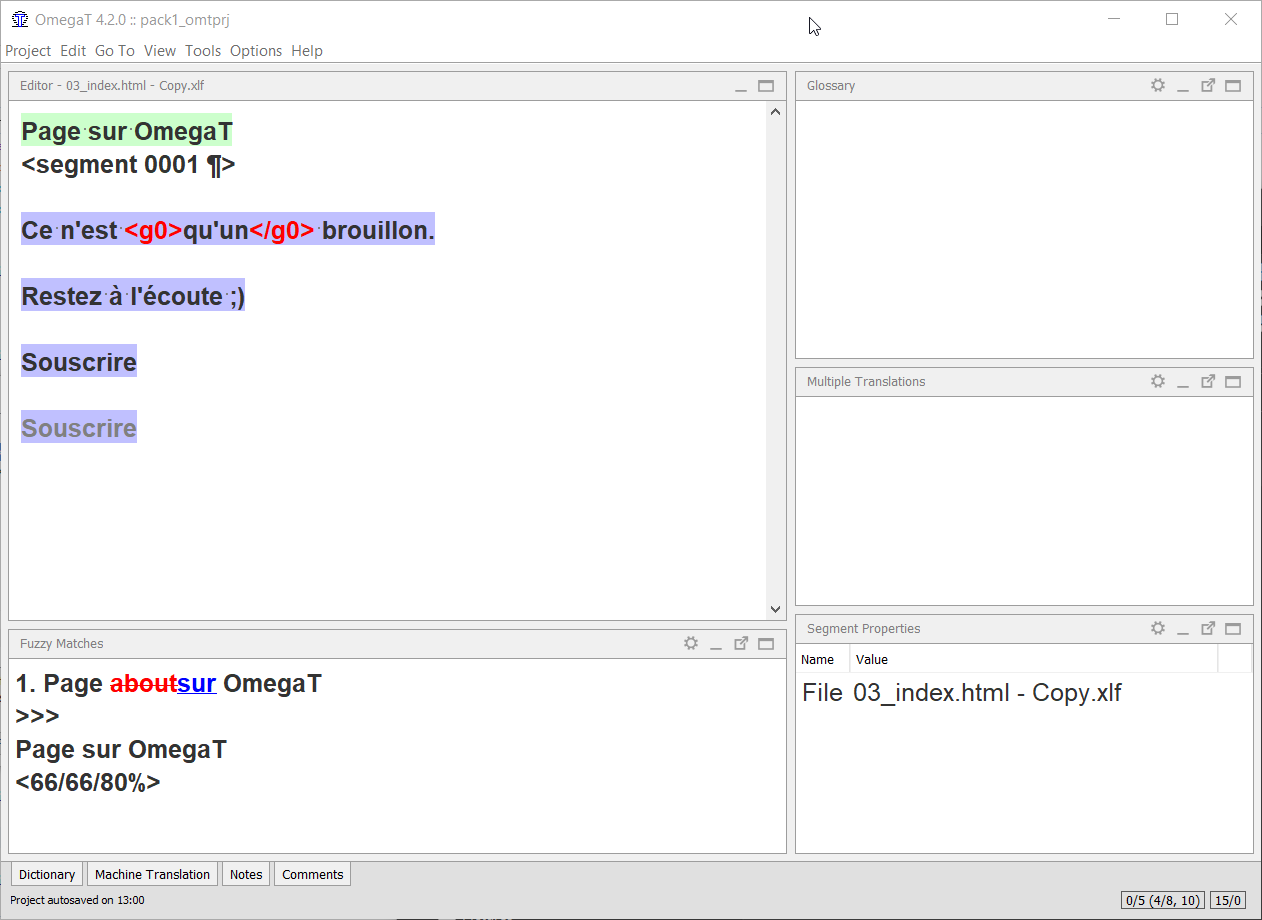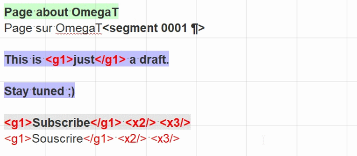This is what it looks like when you import the source XLIFF file in OmegaT.