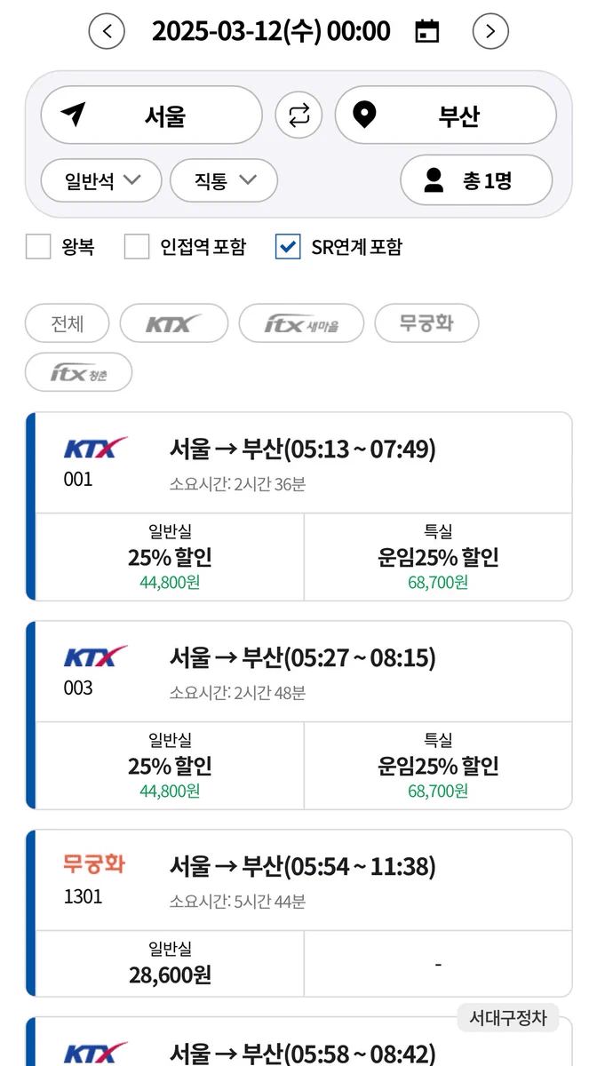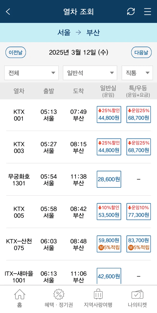 첫번째 사진: 코레일 앱 "코레일톡" 예매 화면,