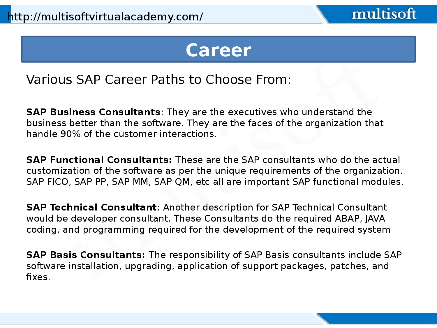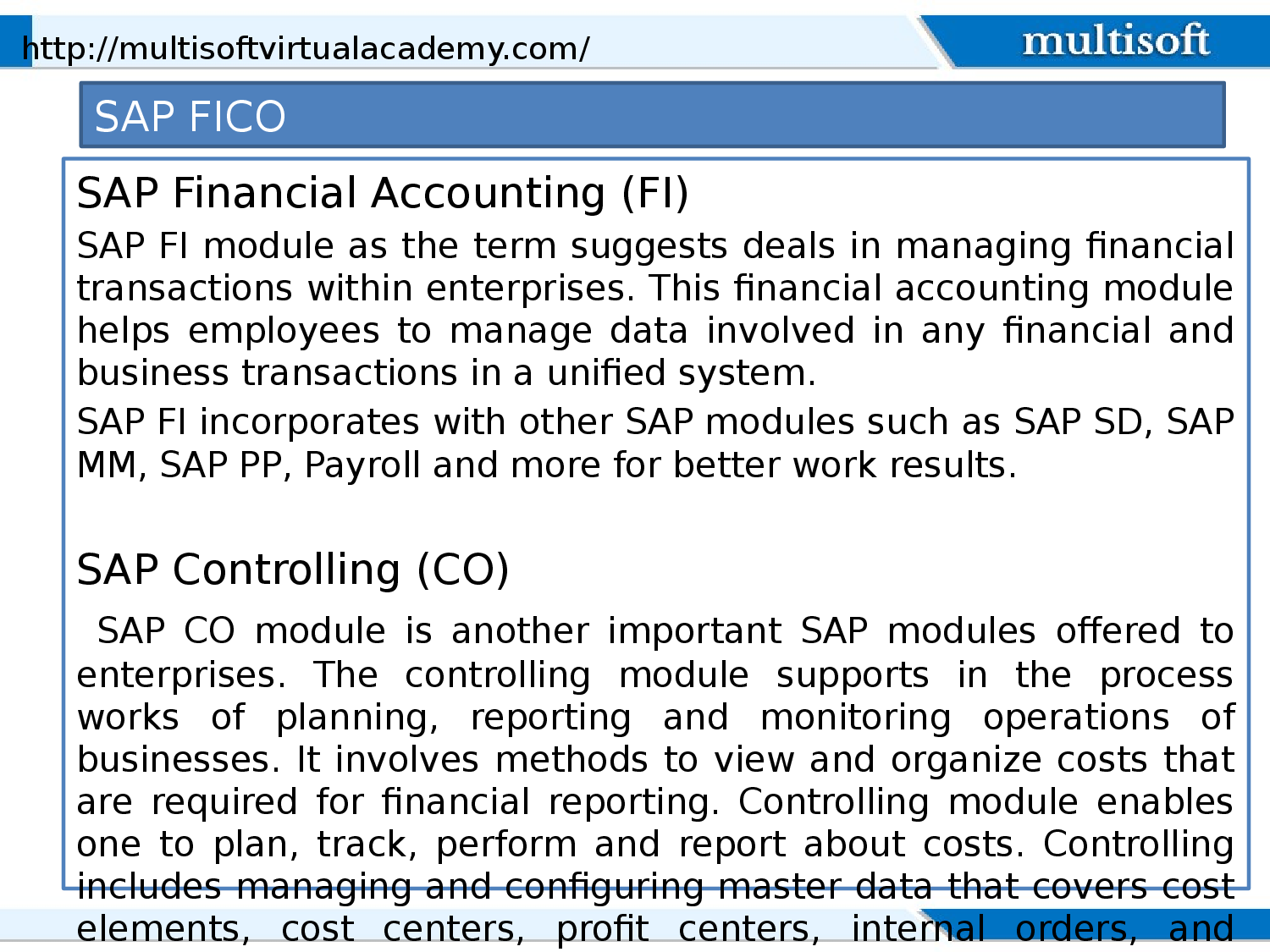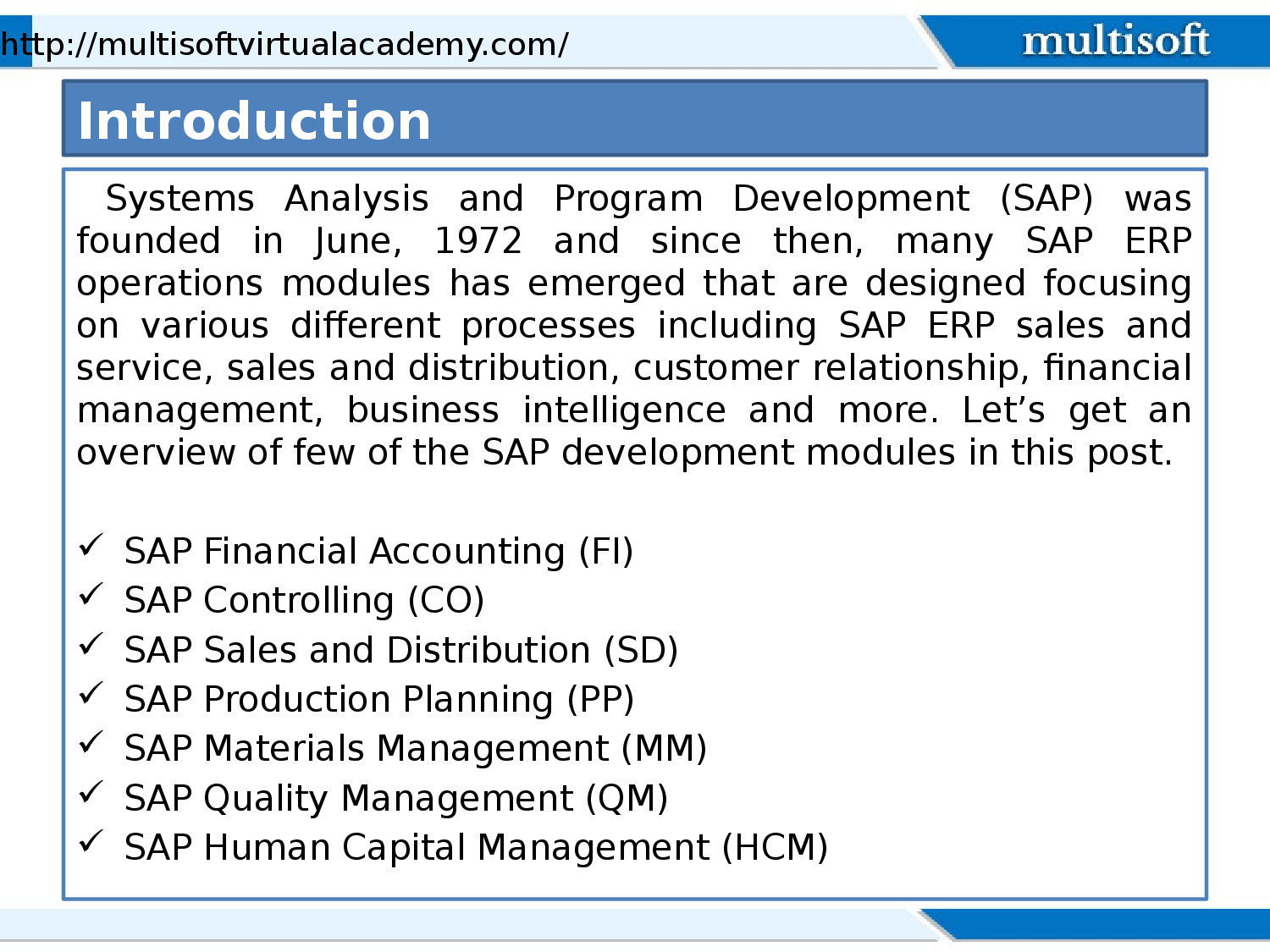 Systems Analysis and Program Development (SAP) was founded in June, 1972 and since then, many SAP ERP operations modules has emerged that are designed focusing on various different processes including SAP ERP sales and service, sales and distribution, customer relationship, financial management, business intelligence and more. Let’s get an overview of few of the SAP development modules in this post. For more info visit: http://www.multisoftvirtualacademy.com/erp/sap-fico-online-training