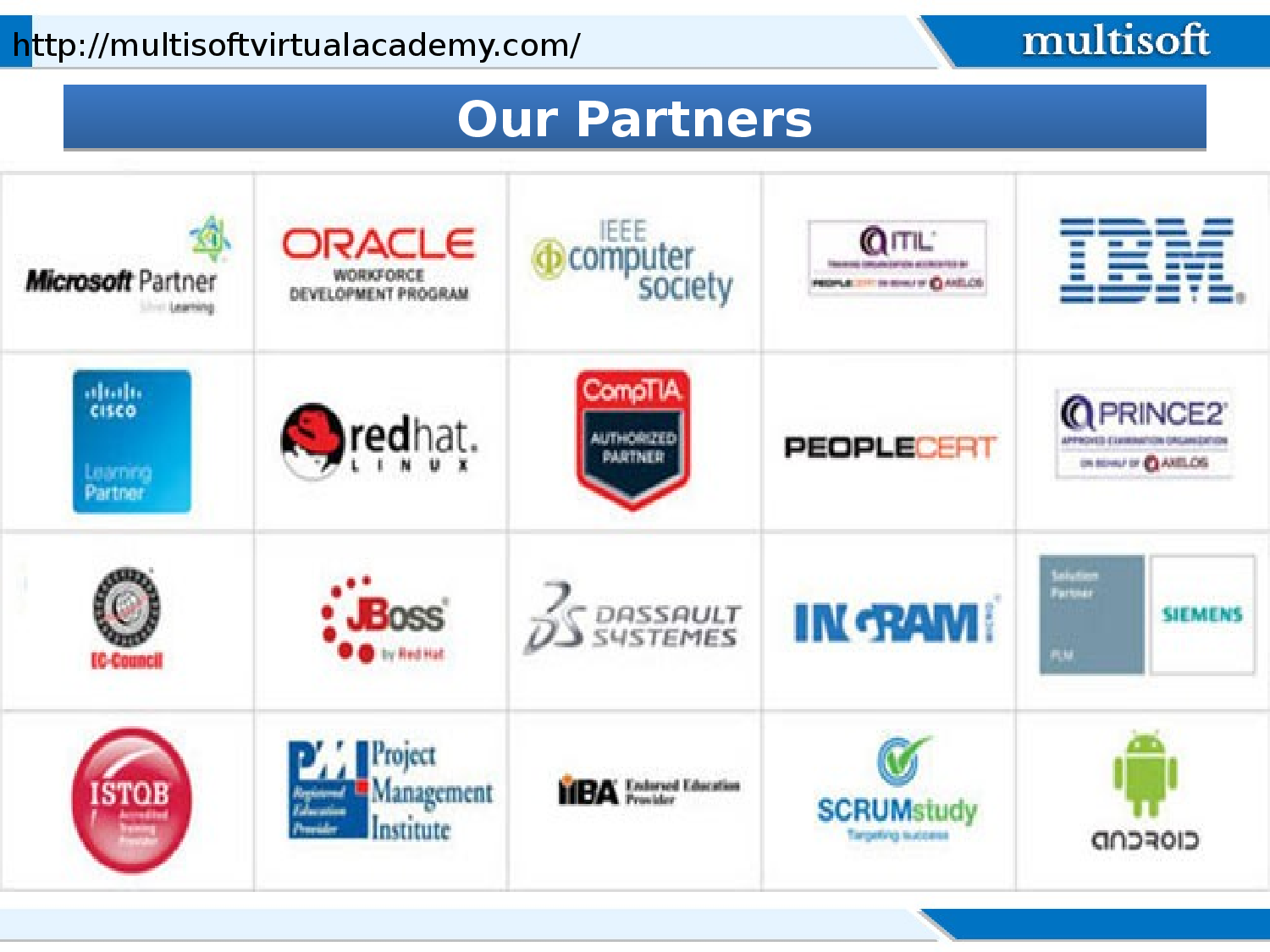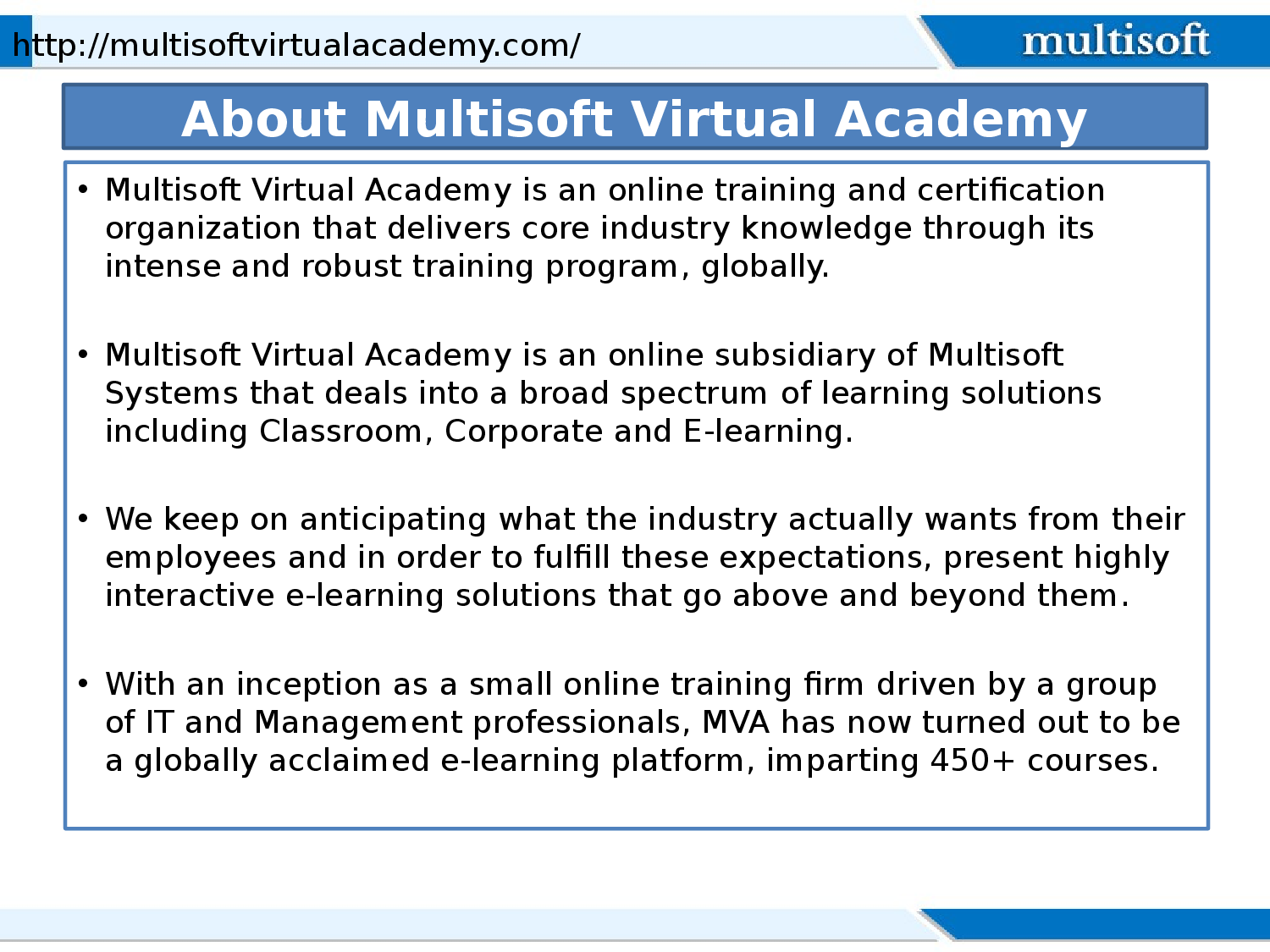 Multisoft Virtual Academy (MVA) is an instructor-led Live online training platform bringing in the best ingredients of learning that is the Subject Matter Expert right at your doorstep (read online through your PC or laptop), Practice Tests and Mock