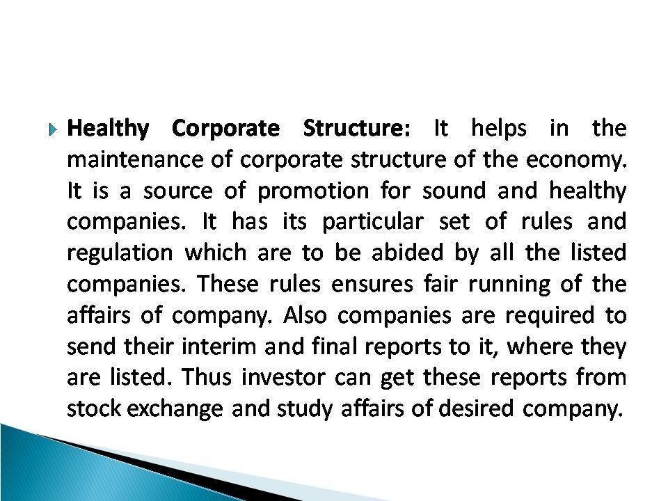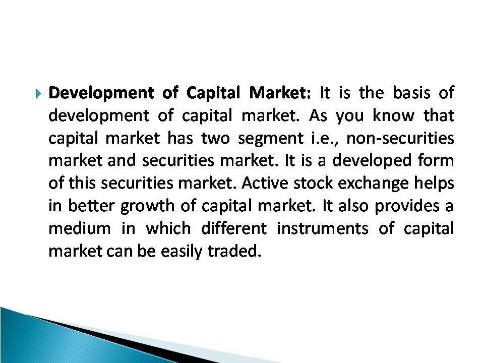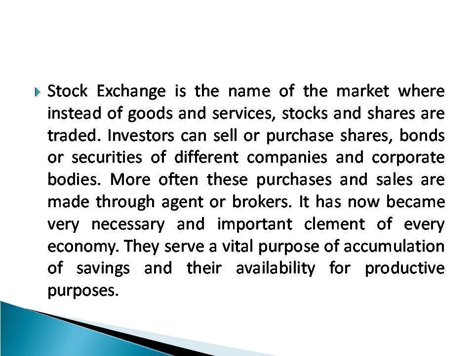Stock Exchange is the name of the market where instead of goods and services, stocks and shares are traded. Investors can sell or purchase shares, bonds or securities of different companies and corporate bodies. More often these purchases and sales are made through agent or brokers. It has now became very necessary and important clement of every economy. They serve a vital purpose of accumulation of savings and their availability for productive purposes.
