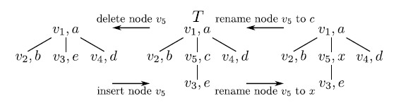 A simple edit script between two ordered labeled trees, consisting of three kinds of edit action: