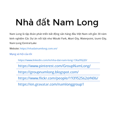 Nam Long là tập đoàn phát triển bất động sản hàng đầu Việt Nam với gần 30 năm kinh nghiệm Mail: info.nhadatnamlong@gmail.com Address: Số 6 Nguyễn Khắc Viện, P. Tân Phú, Quận 7, TP.Hồ Chí Minh SĐT: 0938 38 39 30 Website: https://nhadatnamlong.com.vn/