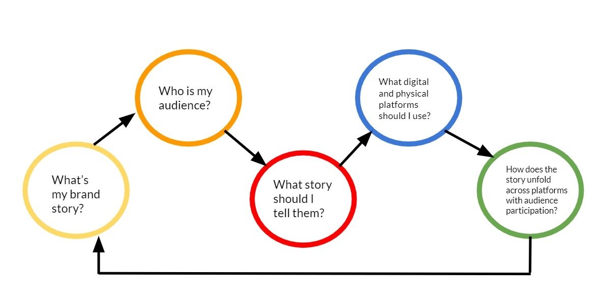 Defined as a coordinated storytelling experience across multiple media platforms. Marketers solicit the active participation of the audience and attempt to spread the narrative with the help of viral marketing practices. Using the core fan base to share the narrative to a larger audience.