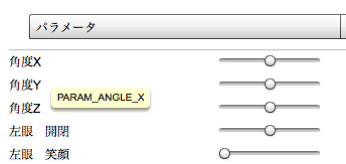 PARAM_Y<input type="range" id="L2D_Y" value="0.0" min="-30.0" max="30.0" step="1.0">// グローバル変数として、スライダーを取得