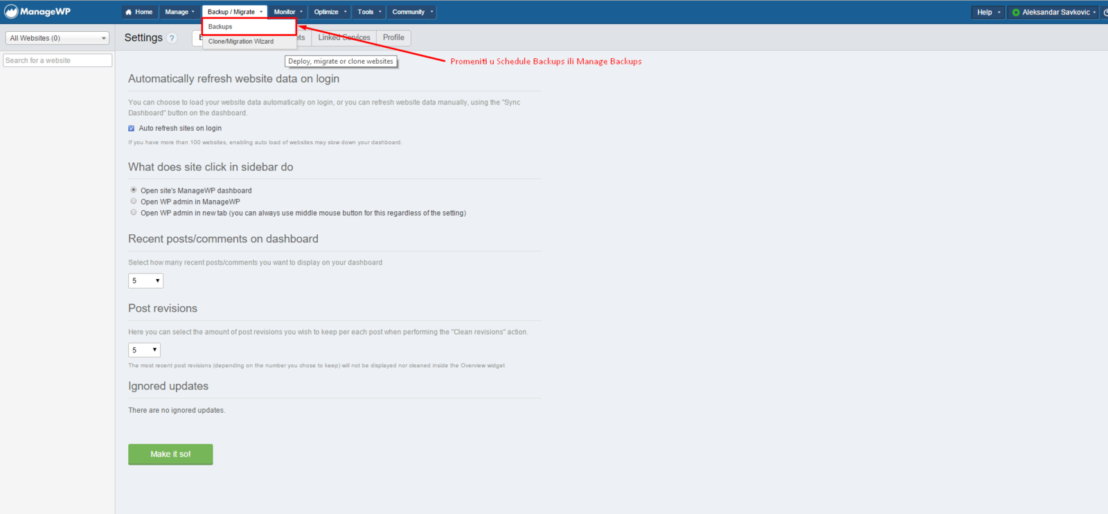 Dobijamo tikete da se razlikuju updates ili da se 20 dana nije pokrenuo backup a desi se da sajt ne moze da se konektuje.Korisnik prekine syncing i ne vidi koliko sajtova je crveno ustvari pa se desi da im treba backup za restore a backup nije napravljen dugo.Greska je zelena boja dugmeta, jer mislimo da treba kliknuti.Uobičajeno je da je zelena boja za NEXT.Promeniti boju u crveno i dodati text. NPR "ManageWP is gathering websites data".