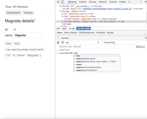 As you can see ng.probe($0) you can access the scope of the component itself and manipulate its various attributes directly from the console.**. You can go ahead and explore the component's model and change things around in its instance: