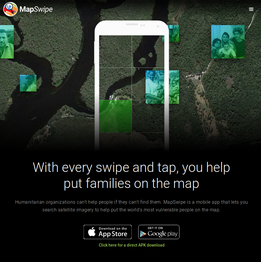 O MapSwipe é um aplicativo para dispositivos móveis que permite pesquisar imagens de satélite para ajudar a mapear comunidades vulneráveis de todo o mundo.