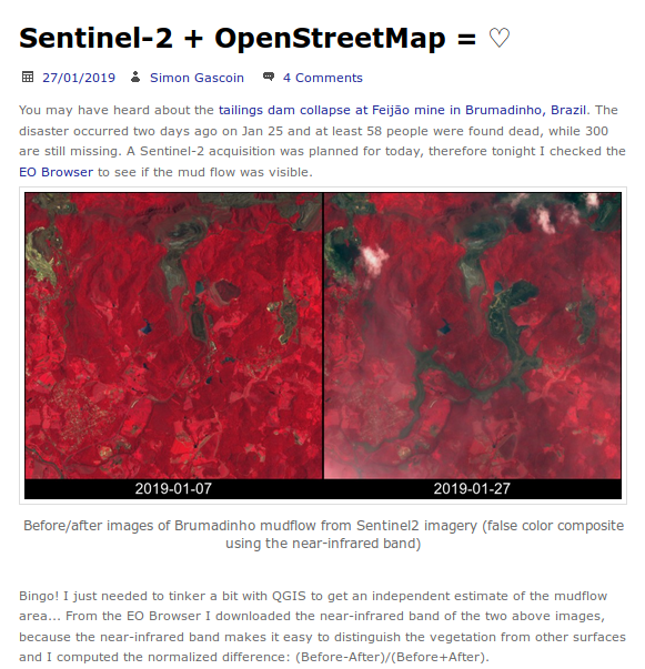 Artigo do Centre d'Etudes Spatiales de la BIOsphère (CESBIO) sobre o mapeamento da área afetada pelo fluxo de lama usando o Sentinel-2