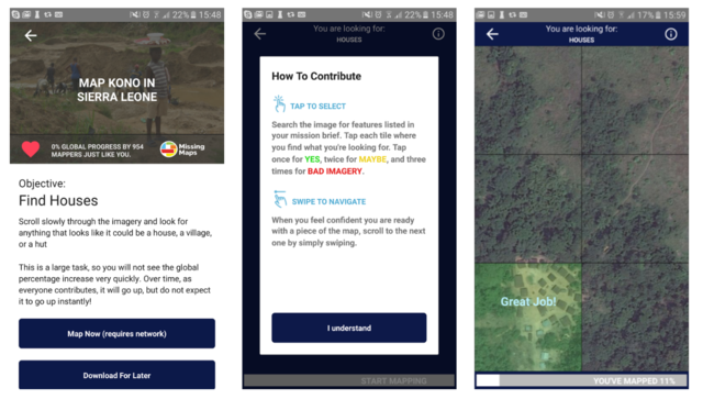 O MapSwipe é um aplicativo para dispositivos móveis que permite pesquisar imagens de satélite para ajudar a mapear comunidades vulneráveis de todo o mundo.