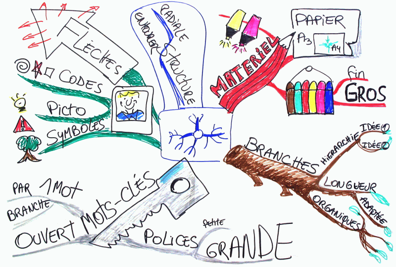 Idées/rubriques principales disposées autour de l'image centrale sous forme de branches