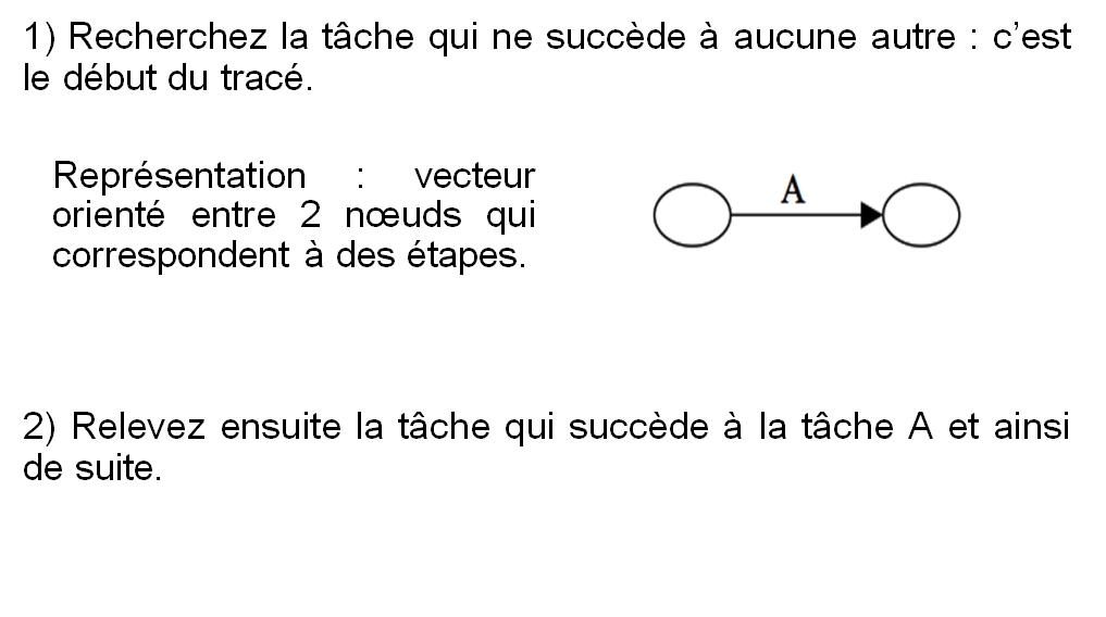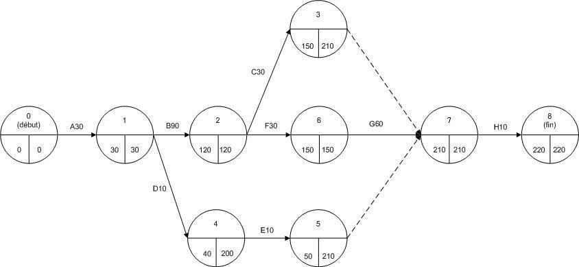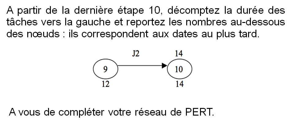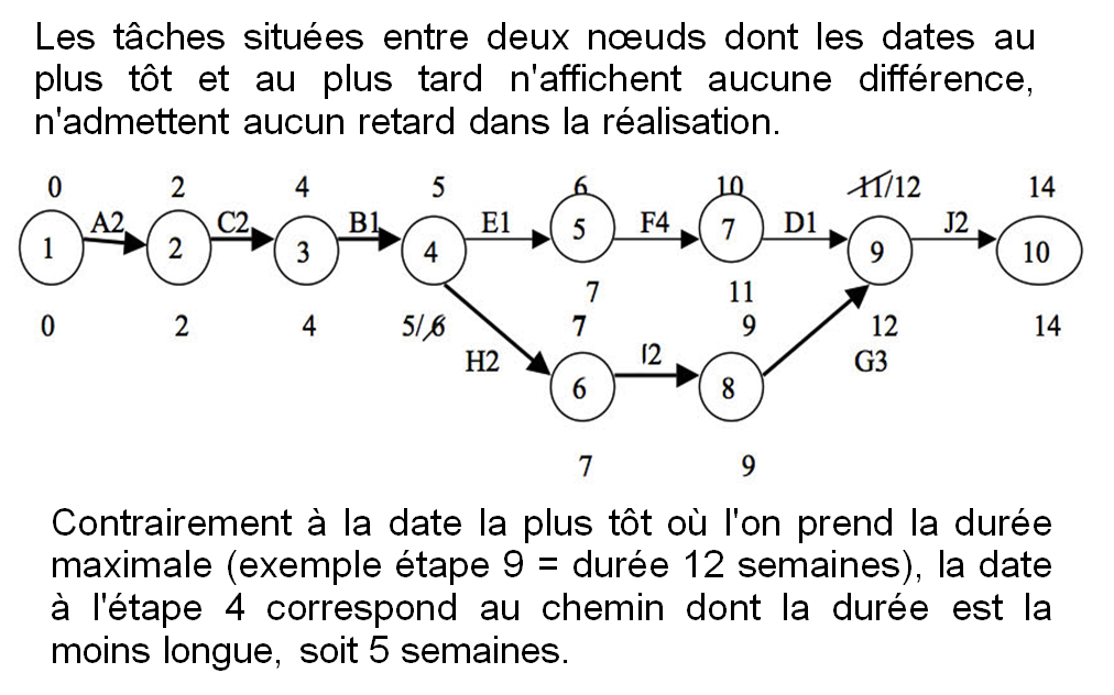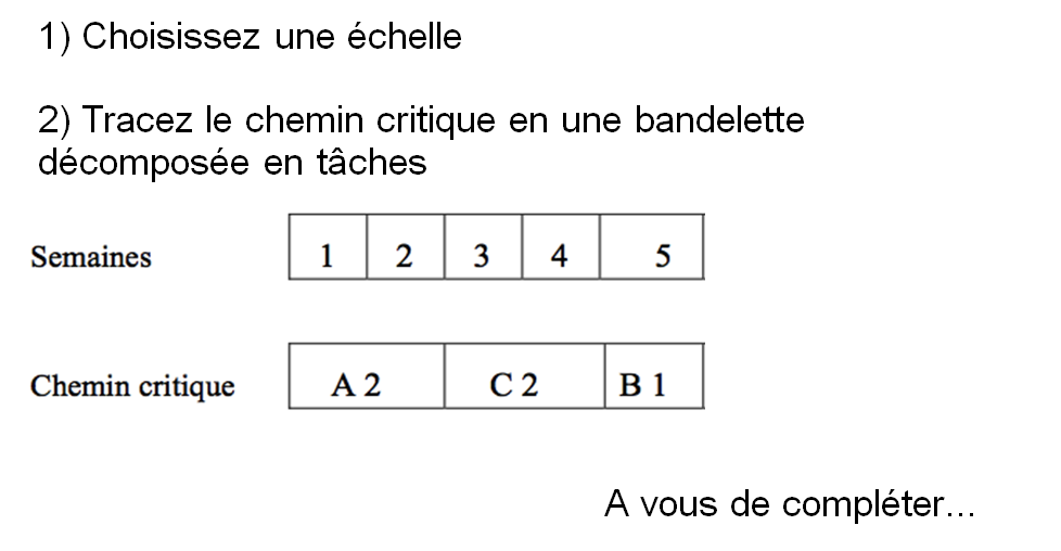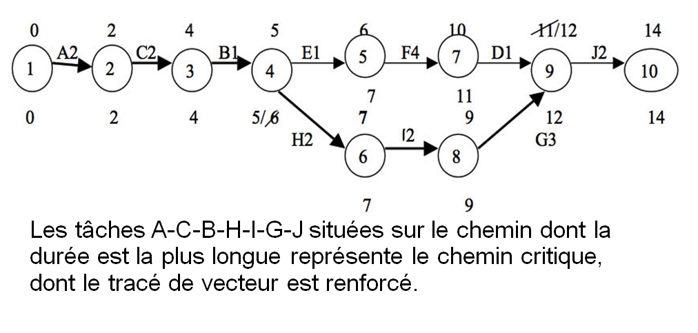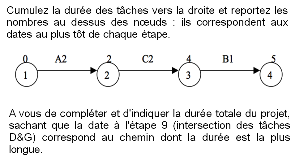3) Indiquez à côté de chaque tâche sa durée (exemple : A2) et numérotez ensuite les étapes dans les noeuds