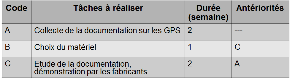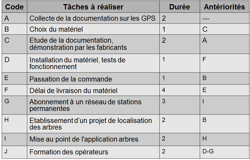 La décision vient d’être prise d’acquérir un GPS. Les tâches à réaliser, ainsi que leur durée, sont répertoriées ci-dessous :