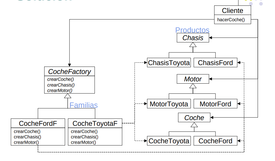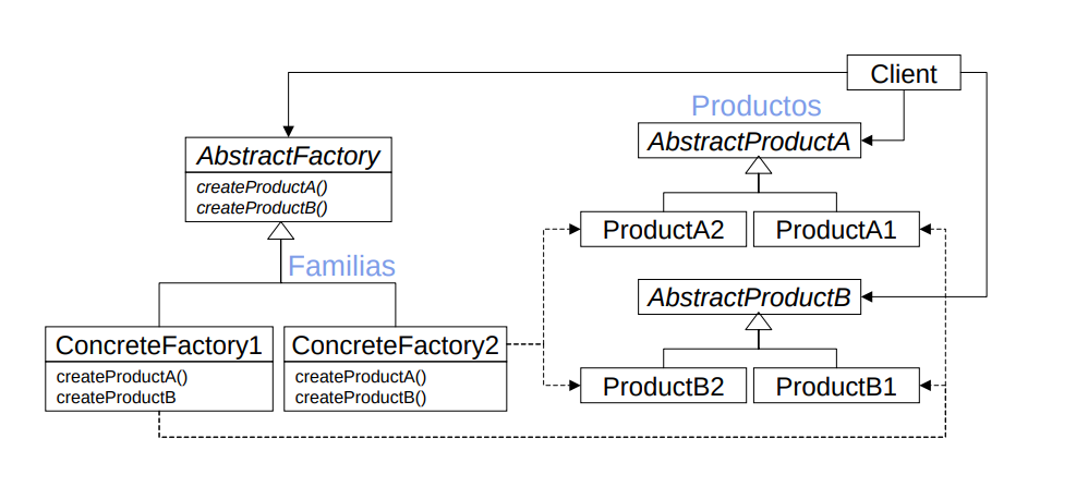 - Define una interfaz para crear familias de objetos relacionados o dependientes, sin especificar sus clases concretas