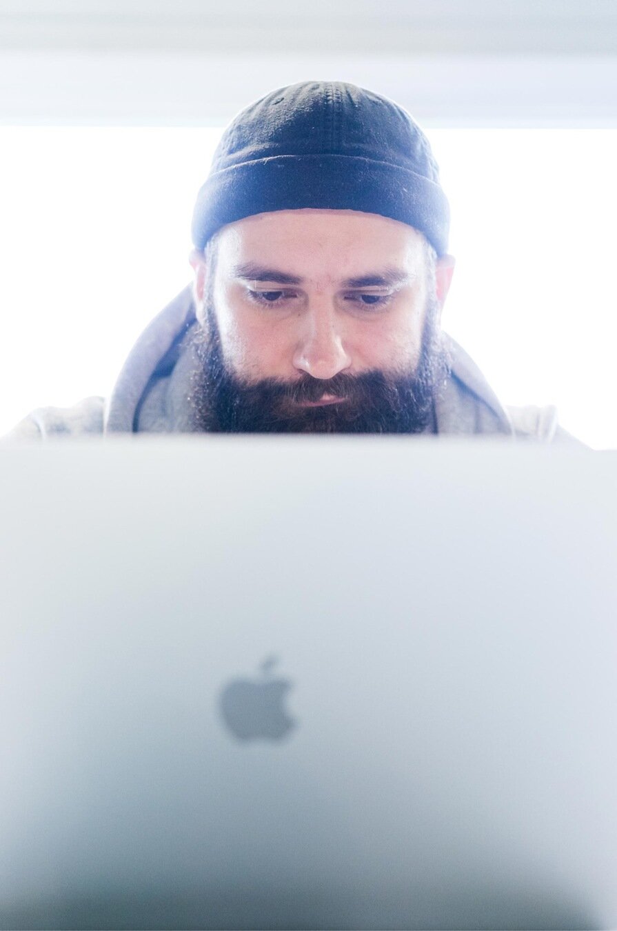 A portrait of a bearded man reading