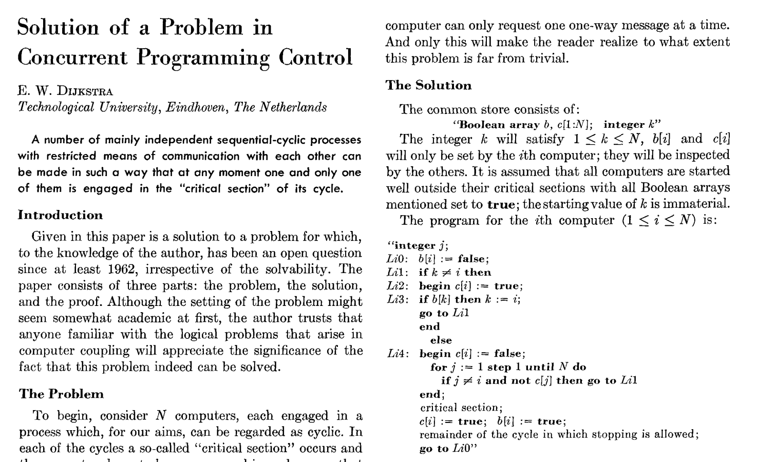 Edgsar W. Dijkstra authors seminal paper on requirements of mutual exclusion locks (1965)