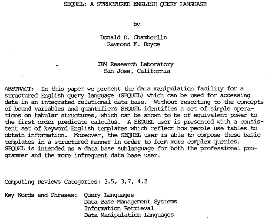Chamberlin and Boyce publish paper on Structured English Query Language, the precursor to modern SQL (1974)