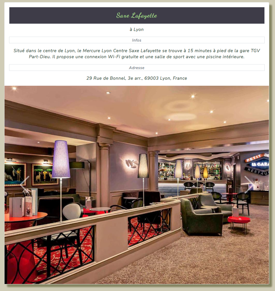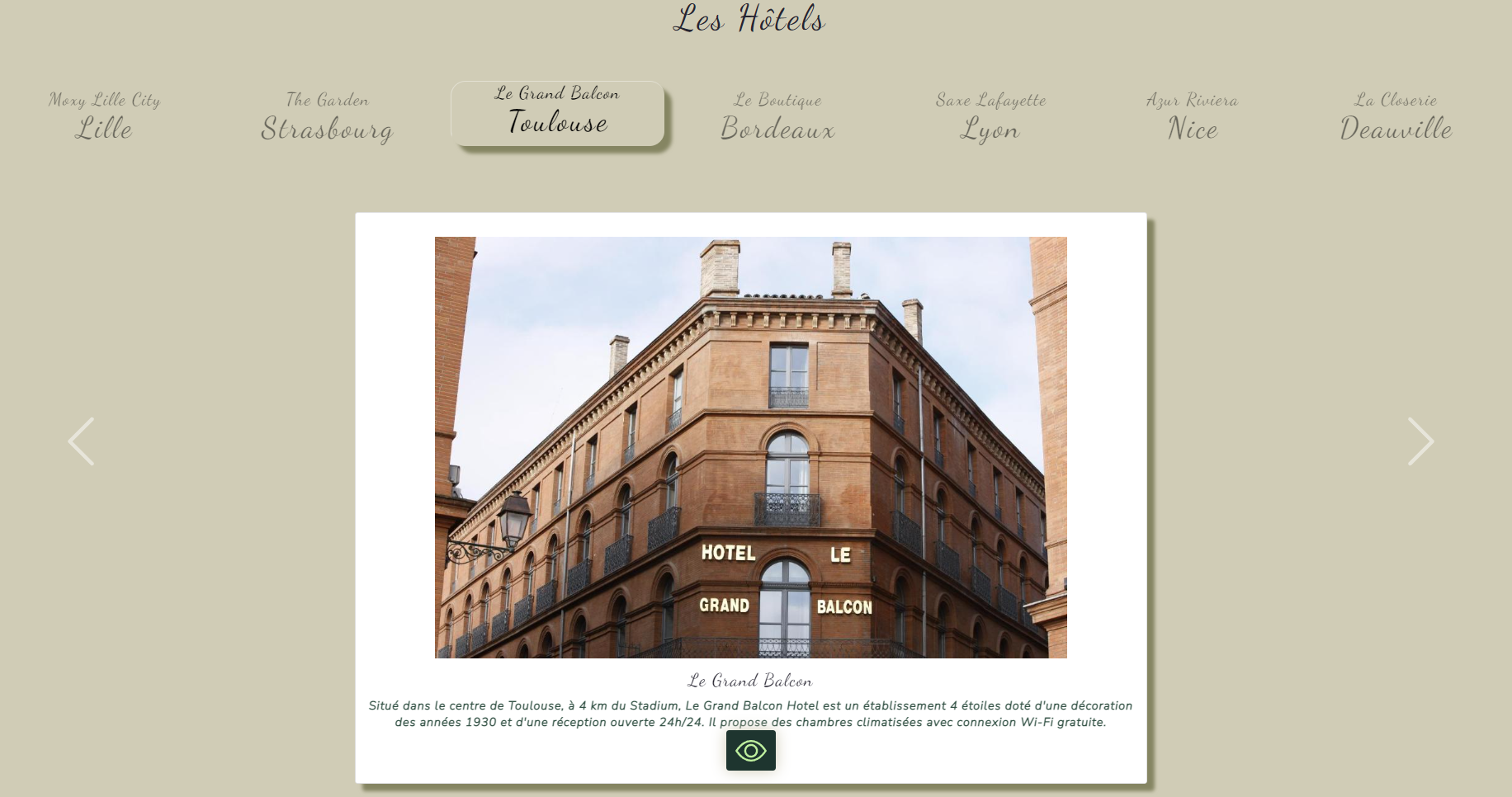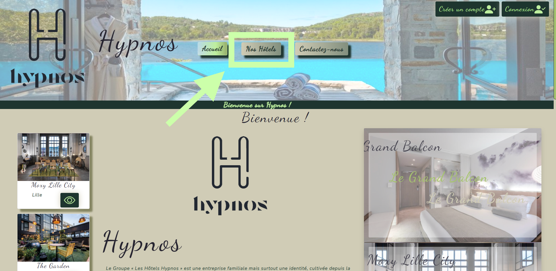 Nous pouvons voir les différents hôtels d'Hypnos en laissant défiler les cards de présentation... Et sélectionner l'hotel désiré en cliquant dessus.