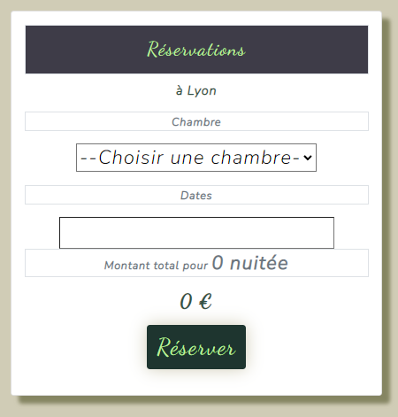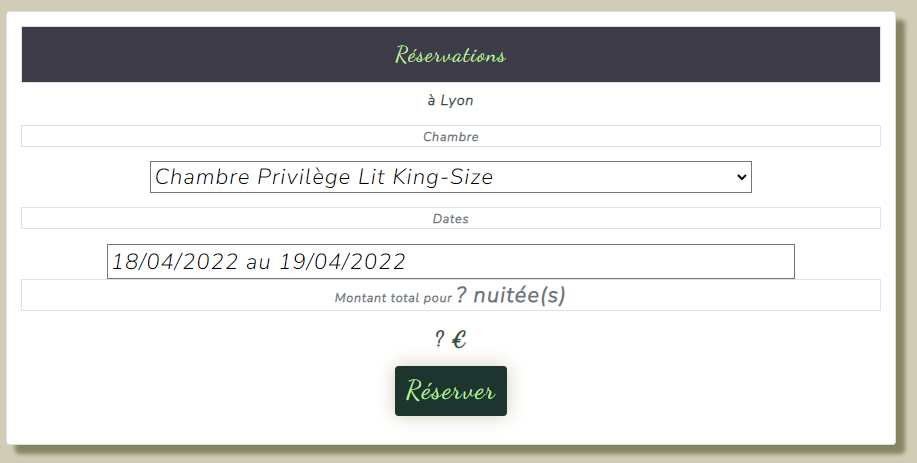 Pour réserver, la chambre est ici présélectionnée et il ne reste qu'à choisir les dates et cliquer sur le bouton réserver. Comme sur la page précédente le visiteur non connecté sera rediriger vers la page de login.