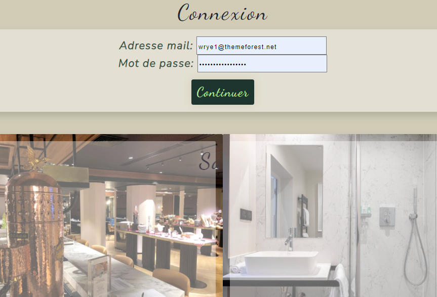 Pour réserver une chambre depuis la page Hôtel, il suffit de la sélectionner et de choisir les dates sur le calendrier mis à jour avec les dates disponibles. En cliquant sur réserver le visiteur sera amené à se connecter et redirigé sur la page ensuite.
