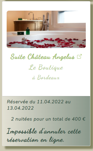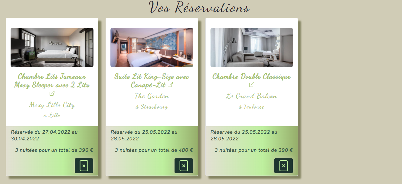 Cette page présente au client connecté les réservations effectuées en lui laissant la possibilité de supprimer ses réservation jusqu'à trois jours avant la date de début en cliquant sur le bouton "supprimer".