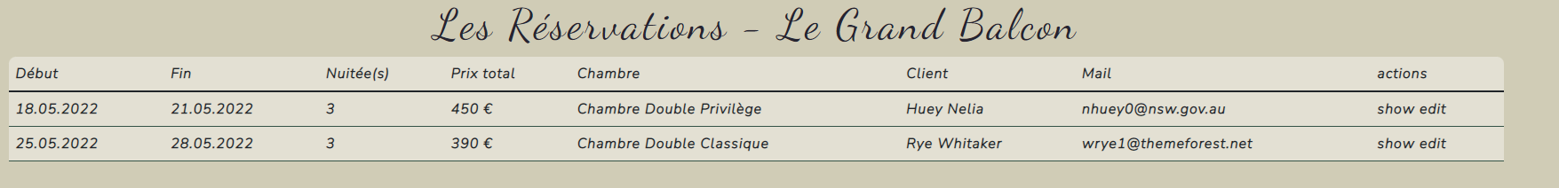 Cette page présente au gérant connecté les réservations effectuées dans son hôtel en listant les dates de début et de fin, le nombre de nuitées et le prix, ainsi que le nom de la chambre et celui du client.